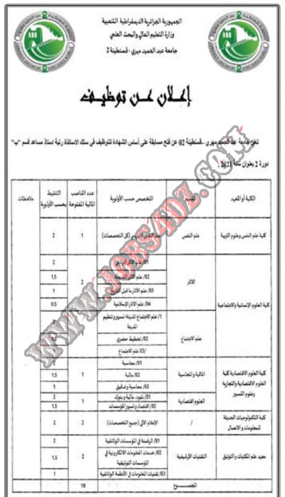 تعلن جامعة عبد الحميد مهري قسنطينة 02 عن فتح مسابقة للتوظيف الخارجي بعنوان سنة 2021 ، للالتحاق بمنصب أستاذ مساعد قسم ”ب* كما هو موضح ادناه