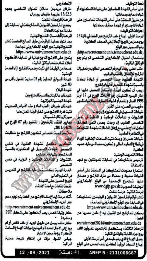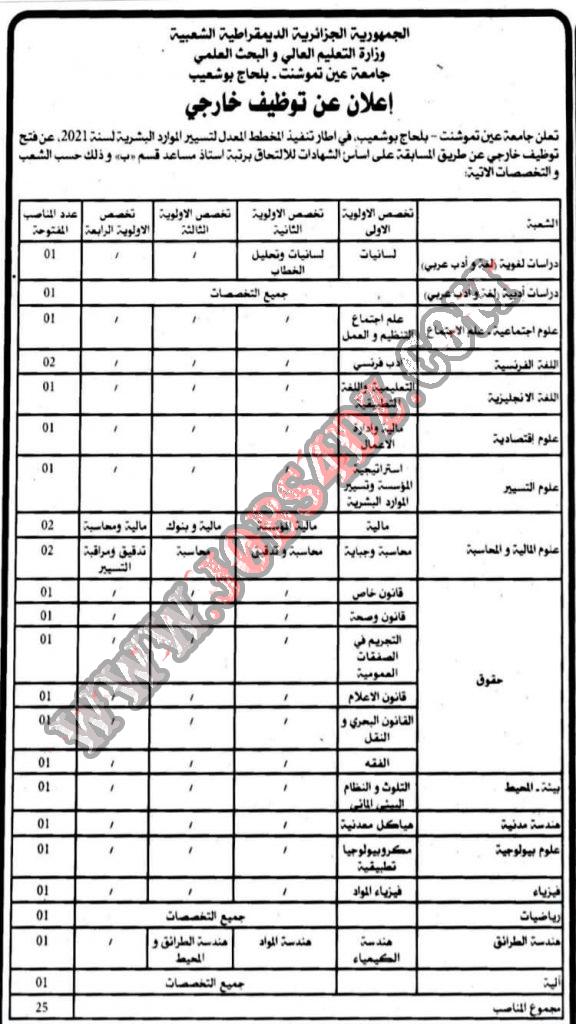 تعلن جامعة عين تموشنت بلحاج بوشعيب في اطار تنفيذ المخطط المعدل لتسيير الموارد البشريى لسنة 2021 عن فتح مسابقة توظيف خارجي عن طريق المسابقة على اساس الشهادات للالتحاق بالرتب التالية