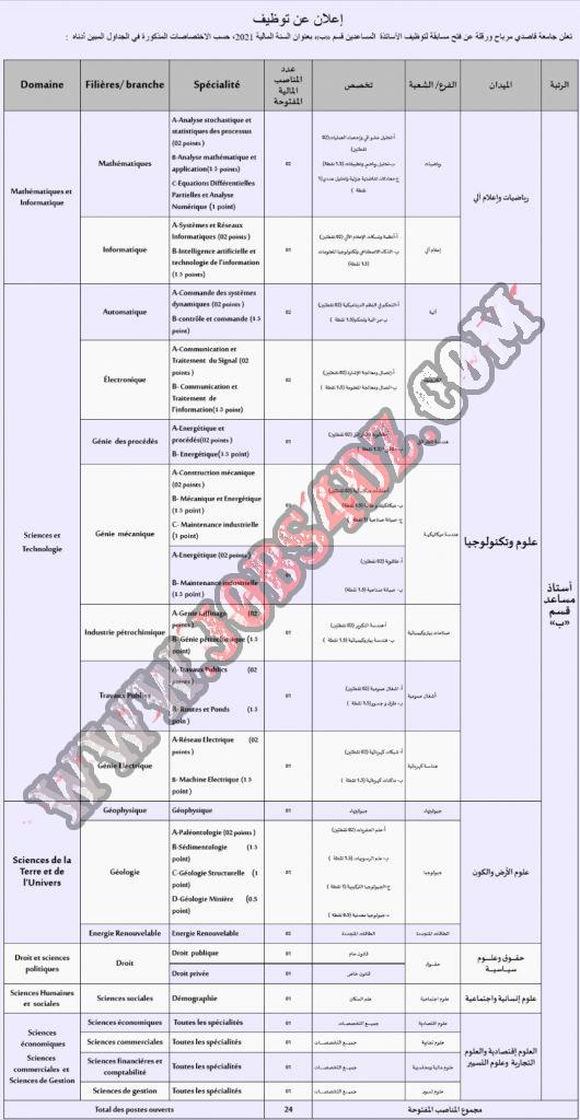 تعلن جامعة قاصدي مرباح ورقلة عن فتح مسابقة لتوظيف الأساتذة المساعدين قسم «ب» بعنوان السنة المالية 2021، حسب الاختصاصات المذكورة في الجداول المبين أدناه :