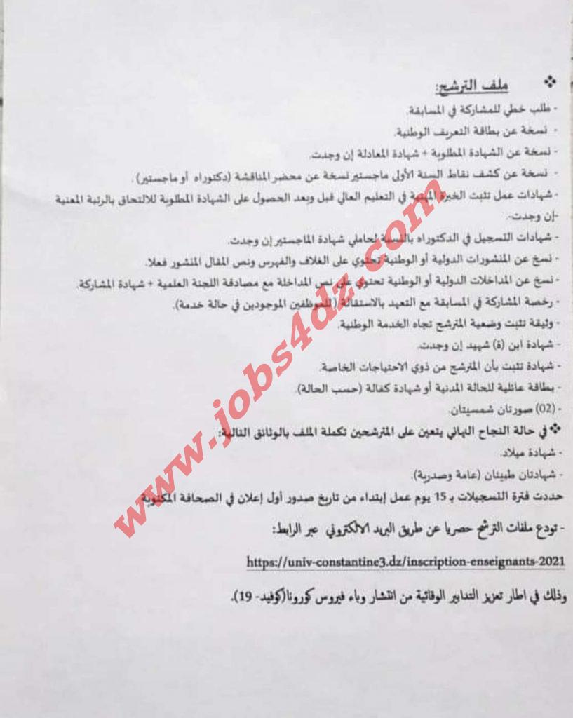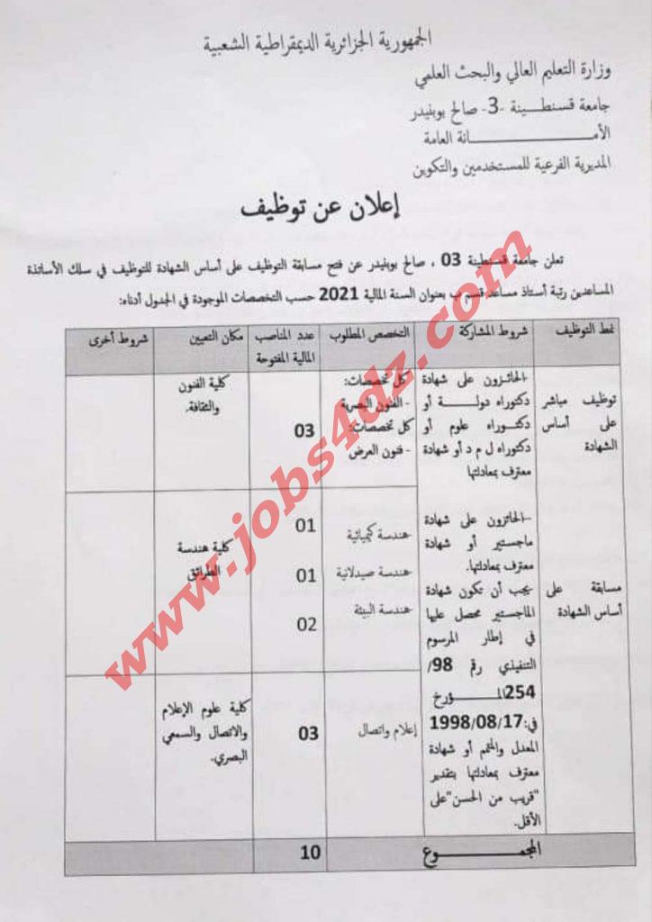 تعلن جامعة قسنطينة 03 صالح بوبنيدر فتح مسابقة للتوظيف على اساس الشهادة للتوظيف في سلك الاساتذة المساعدين رتبة استاذ مساعد قسم ب بعنوان السنة الماليية 2021 حسب التالي