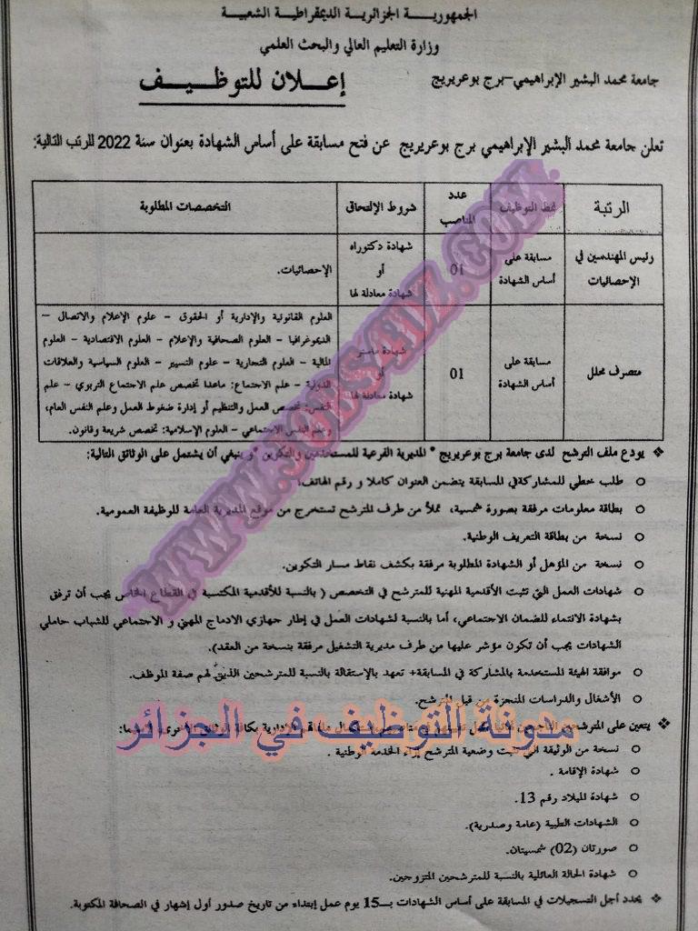 تعلن جامعة محمد البشير الابراهيمي برج بوعريريج عن فتح مسابقة توظيف على اساس الشهادة في الرتب المبينة ادناه