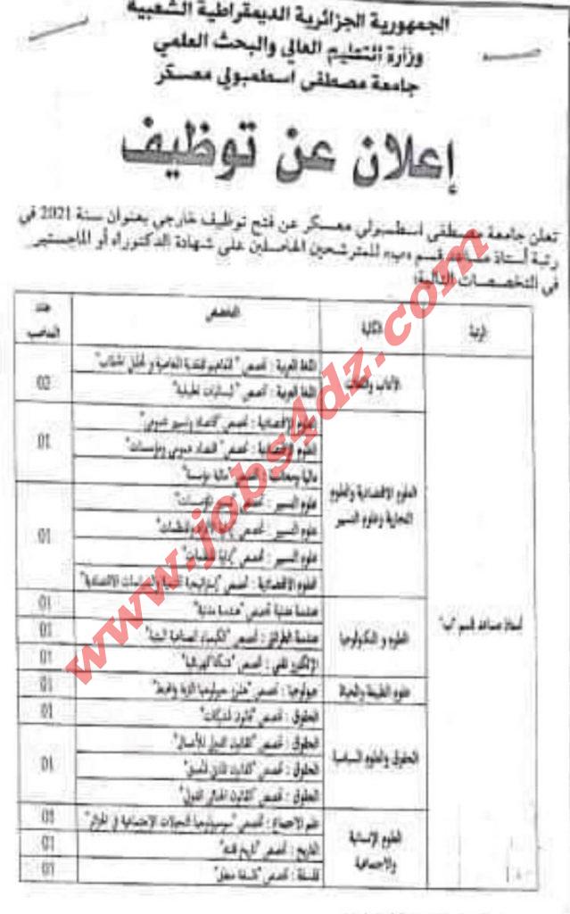 تعلن جامعة مصطفى اسطمبولي معسكر عن فتح مسابقات للتوظف على اسسا الاختبار المهني في مناصب العمل المبينة ادناه بعنوان سنة 2021