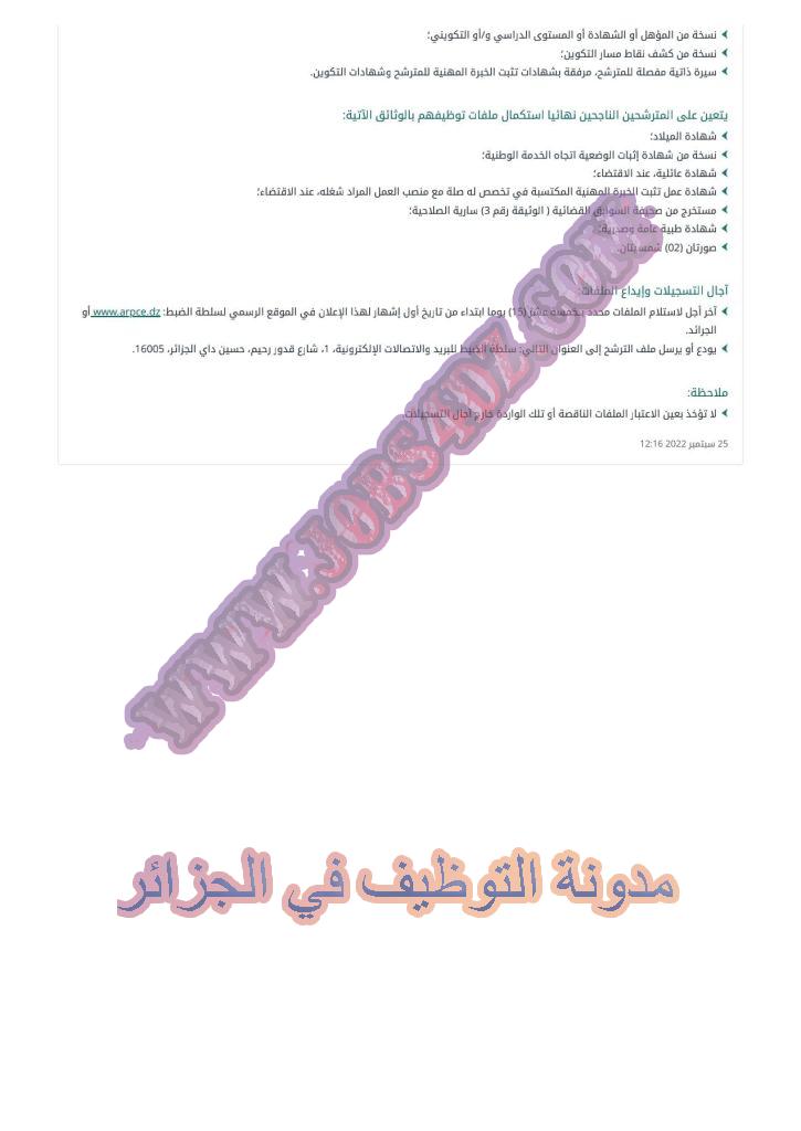 - آخر أجل لاستلام الملفات محدد بــخمسة عشر (15) يوما ابتداء من تاريخ أول إشهار لهذا الإعلان في الموقع الرسمي لسلطة الضبط: www.arpce.dz أو الجرائد.