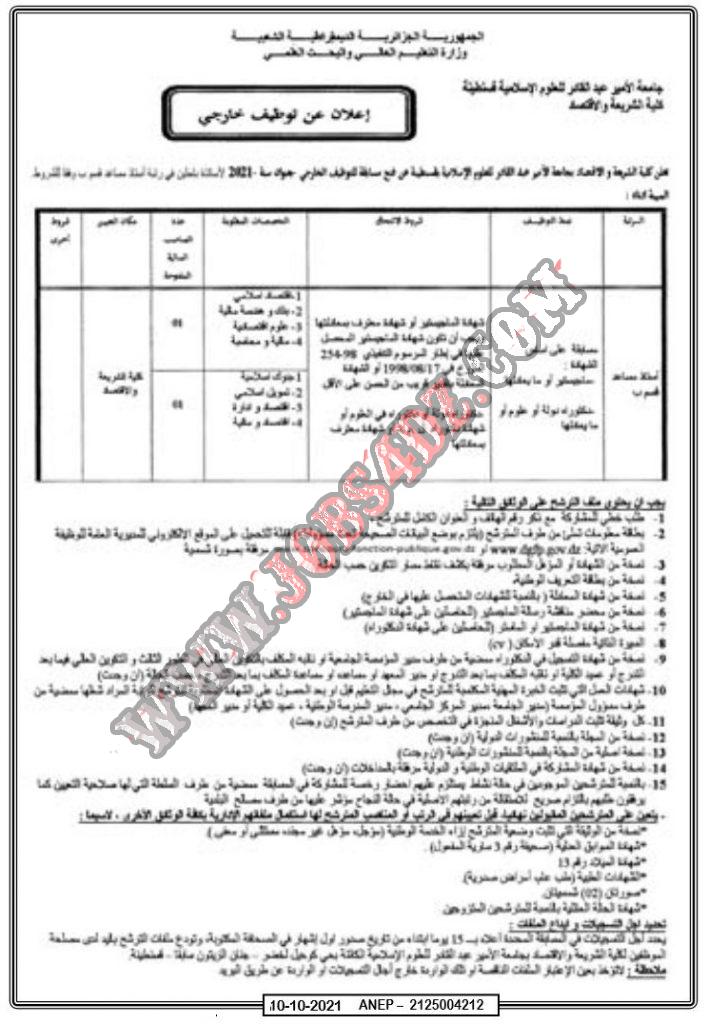 تعلن كلية الشريعة و الاقتصاد بجامعة الامير عبد القادر للعلوم الاسلامية بقسنطينة عن فتح مسابقة للتوظيف الخارجي بعنوان سنة 2021 في المناصب التالية