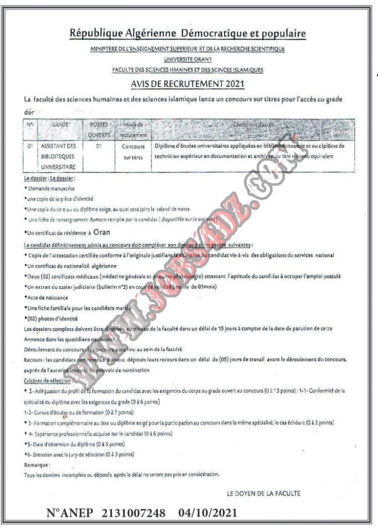 تعلن كلية العلوم الإنسانية والعلوم الإسلامية جامعة وهران 1 عن فتح مسابقة توظيف على اساس الشهادة في المناصب التالية