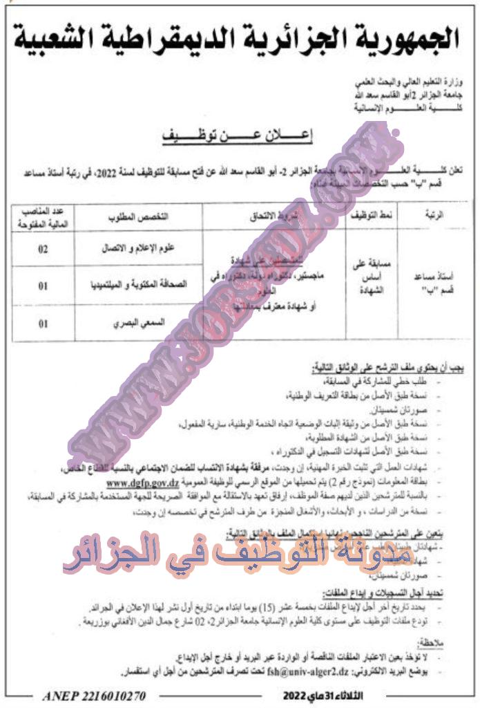تعلن كلية العلوم الانسانية جامعة الجزائر 2 عن فتح مسابقة توظيف اساتذة مساعدين قسم ب على اساس الشهادة بعنوان السنة المالية 2022 كما هو موضح ادناه