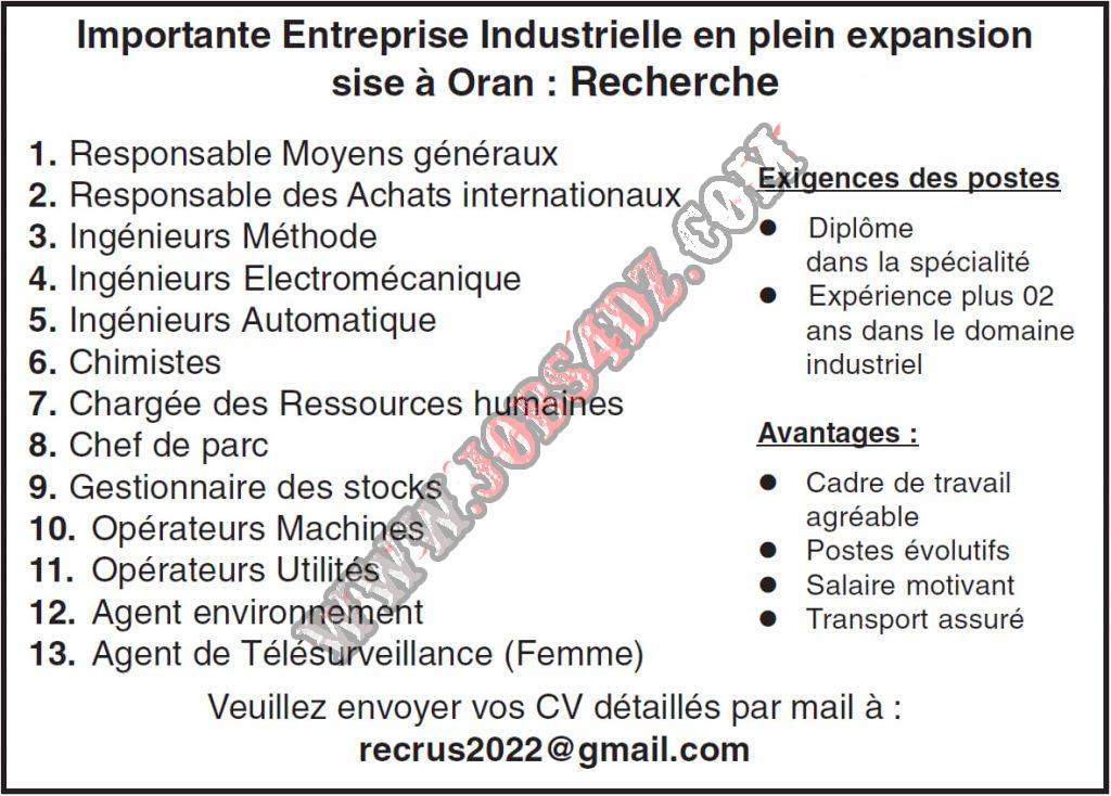 توظيف لعديد من المناصب من قبل مؤسسة صناعية هامة في أوج توسعها بولاية وهران