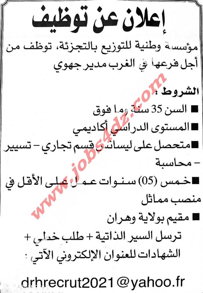 مؤسسة وطنية للتوزيع بالتجزئة توظف على مستوى فرعها المتواجد بالغرب الجزائري :
