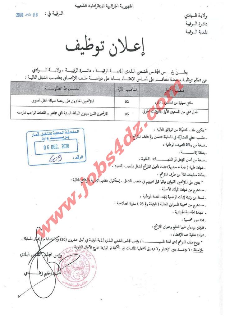 يعلن رئيس المجلس الشعبي البلدي لبلدية الرقيبة دائرة الرقيبة ولاية الوادي عن تنظيم مسابقة توظيف بصفة متعاقد على اساس الانتقاء بناءا على دراسة الملف للالتحاق بالمناصب التالية