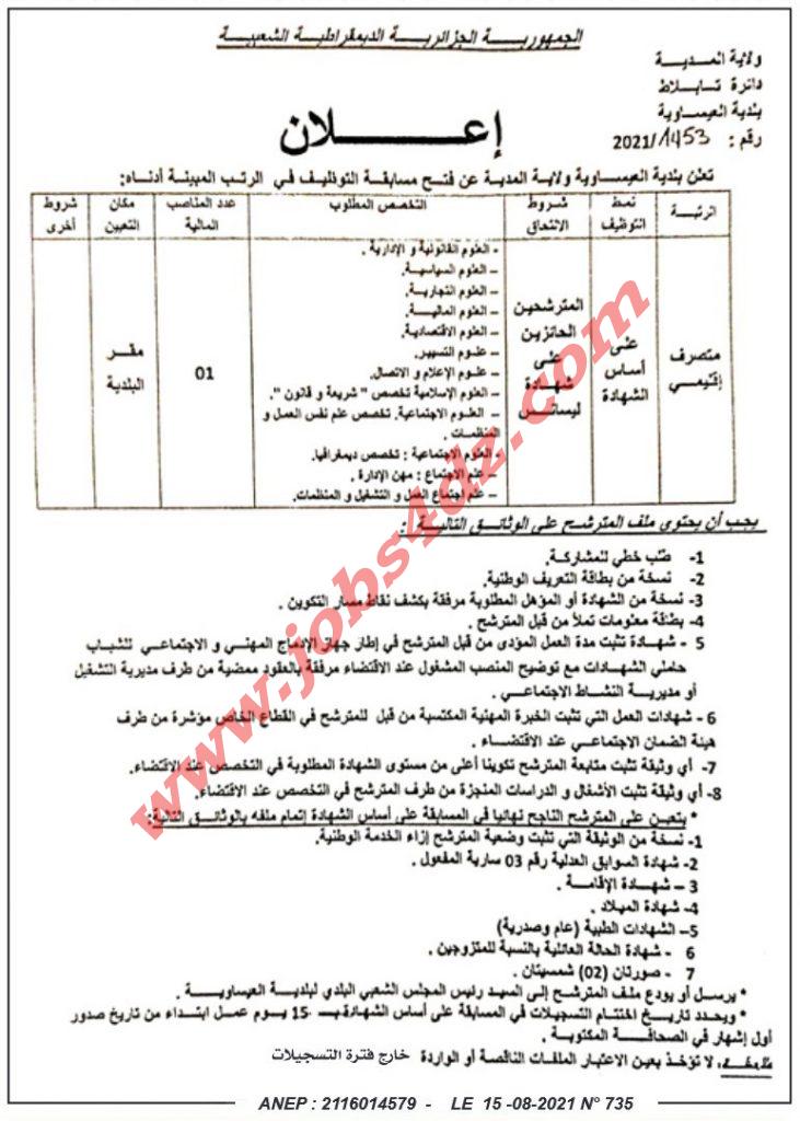 تعلن بلدية العيساوية ولاية المدية عن فتح مسابقة التوظيف في الرتب المبينة ادناه