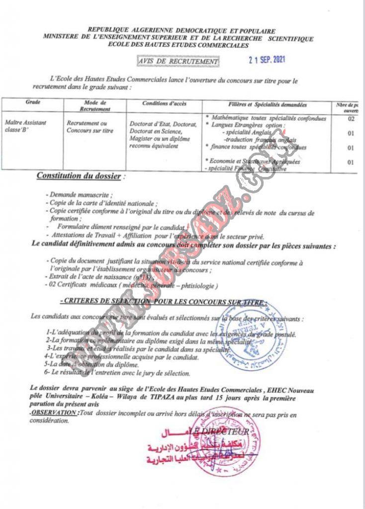 تعلن مدرسة الدراسات العليا التجارية بالقليعة تيبازة عن فتح مسابقات على اساس الشهادات للالتخاق بالرتب التالية