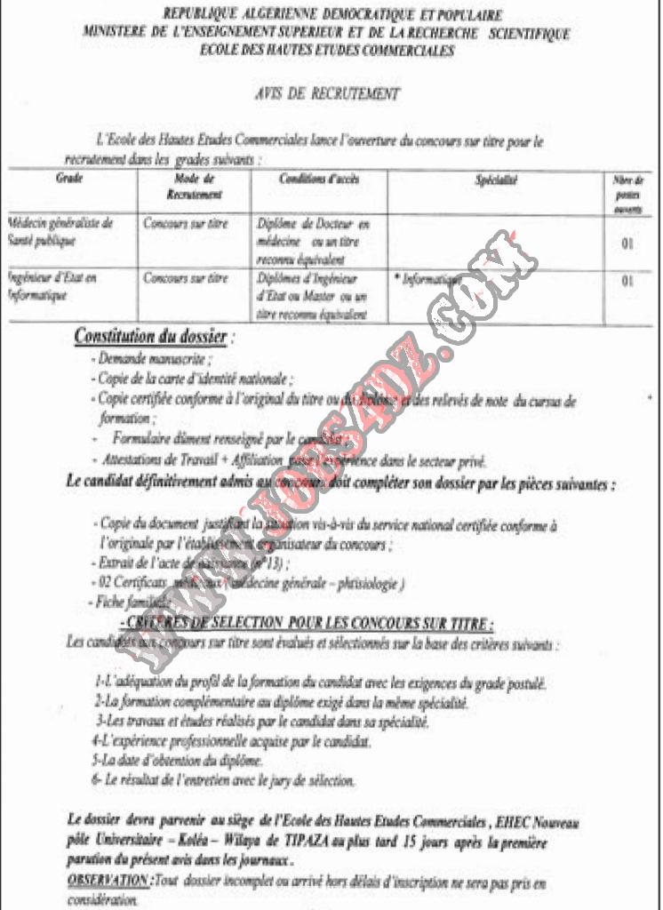 تعلن مدرسة الدراسات العليا التجارية بالقليعة تيبازة عن فتح توظيف على اساس الشهادة للالتحاق بالرتبة التالية