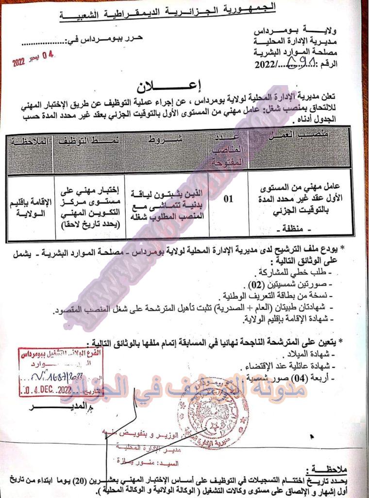 يعلن مديرية الادارة المحلية لولاية بومرداس عن فتح مسابقة توظيف على اساس الاختبار المهني في الرتب المبينة ادناه