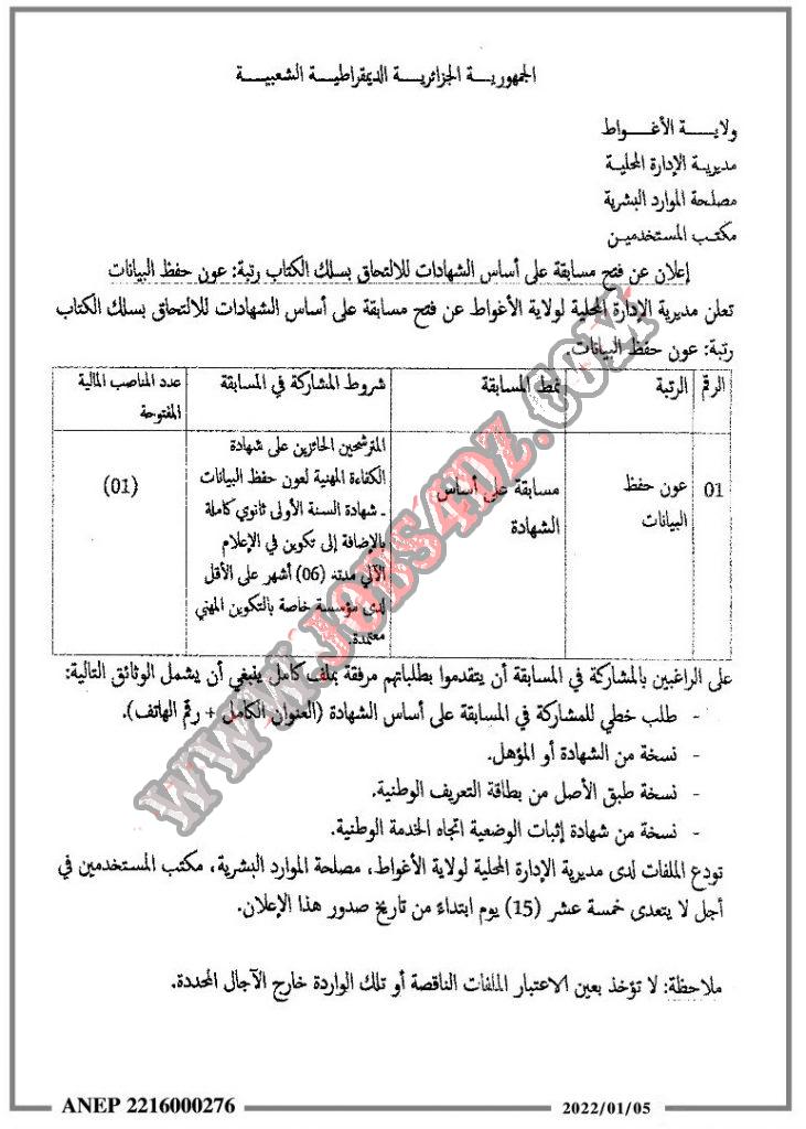 تعلن مدبربة الادارة المحلية لولاية الاغواط عن فتح مسابقة توظيف على اساس الشهادة في المناصب التالية