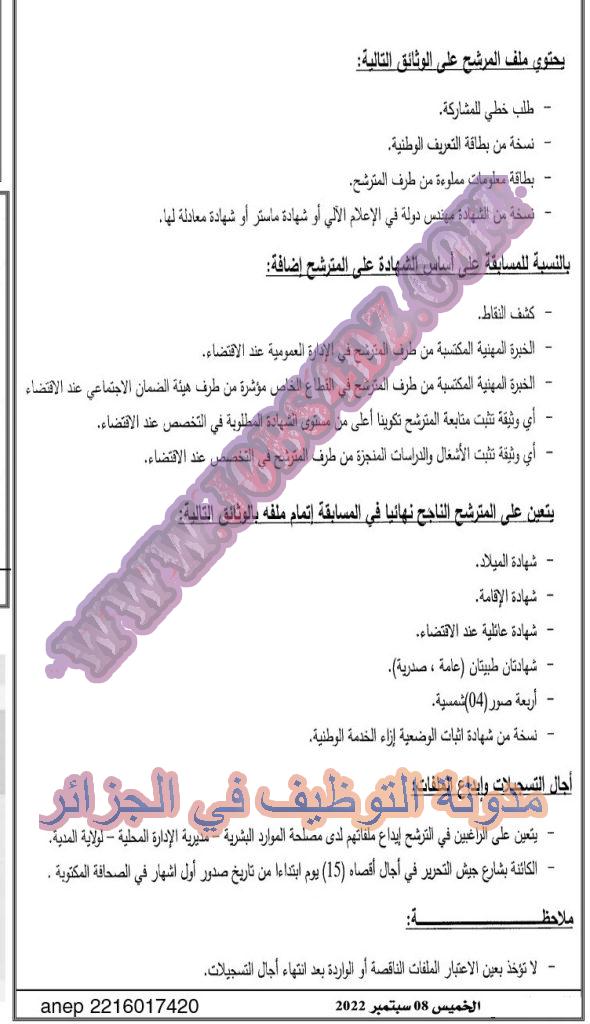 تعلن مديرية الادارة المحلية لولاية المدية عن فتح مسابقة توظيف على اساس الشهادة بعنوان السنة المالية 2022 في المناصب المبينة ادناه