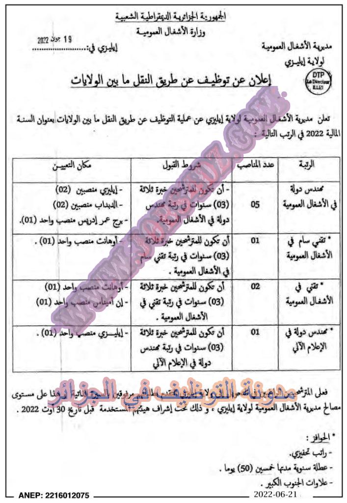 تعلن مديرية الاشغال العمومية لولاية ايليزي عن عملية توظيف عن طريق النقل مابين الولايات بعنوان السنة المالية 2022 في الرتب التالية