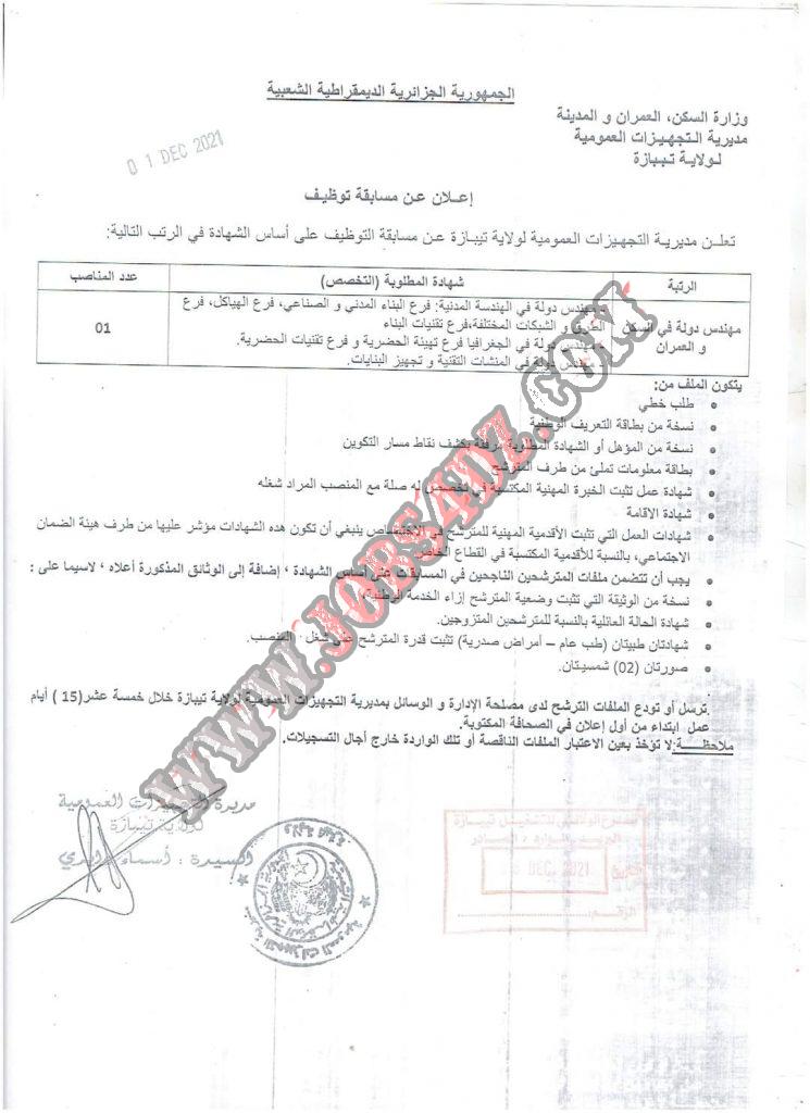 تعلن مديرية التجهيزات العمومية لولاية تيبازة عن مسابقة للتوظيف على اساس الشهادة في الرتب التالية