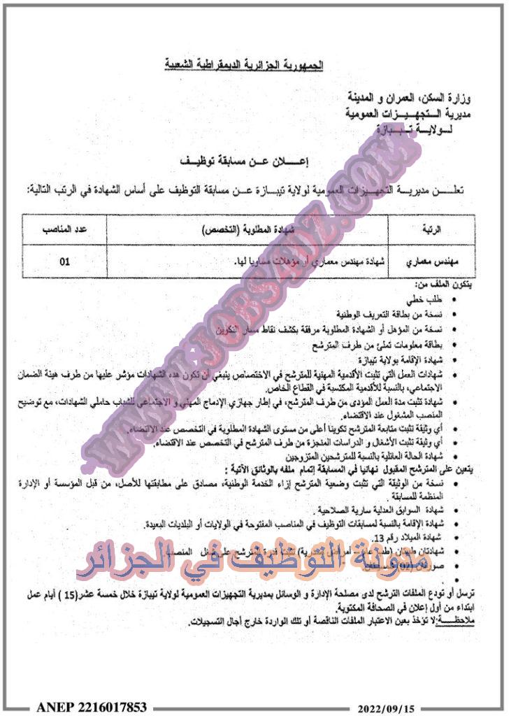 تعلن مديرية التجهيزات العمومية لولاية تيبازة عن فتح مسابقة توظيف على اساس الشهادة بعنوان السنة المالية 2022 في المناصب المبينة ادناه