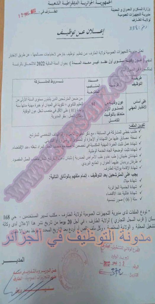 تعلن مديرية التجهيزات العمومية لولاية الطارف عن فتح مسابقة توظيف على اساس الاختبار المهني في الرتب المبينة ادناه