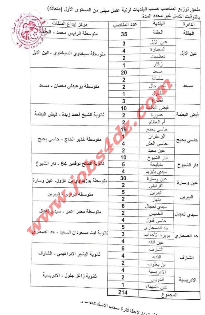 تعلن مديرية التربية لولاية الجلفة عن فتح مسابقة توظيف العمال المهنيين على اساس الاختبار المهني للالتحاق بالرتب التالية