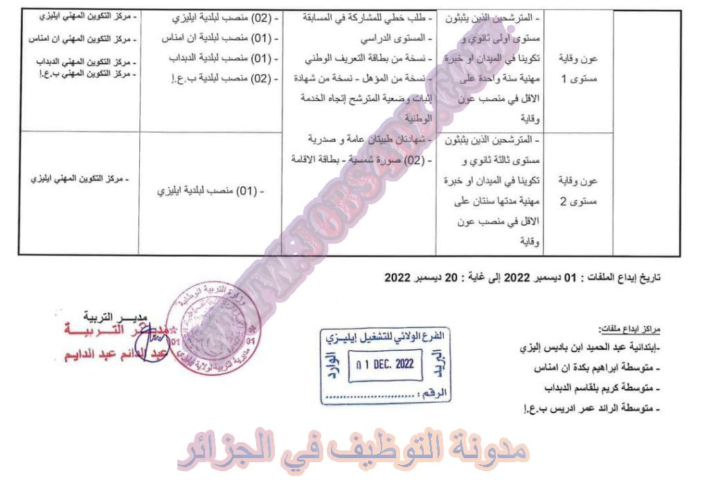 يعلن مديرية التربية لولاية ايليزي عن فتح توظيف على اساس الاختبار المهني في الرتب المبينة ادناه