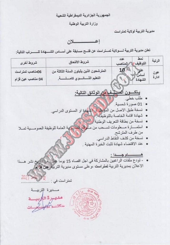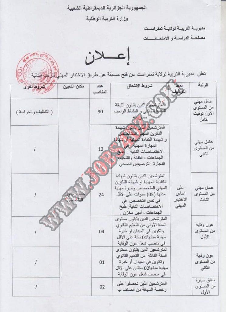 تعلن مديرية التربية لولاية تمنراست عن فتخ مسابقات للتوظيف على اساس الشهادة وعن طريق الاختبار المهني في المناصب المبينة ادناه