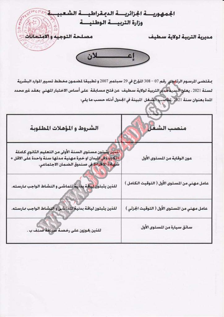تعلن مديرية التربية لولاية سطيف عن فتح مسابقة على أساس الاختبار المهني بعقد غير محدد المدة بعنوان 2021 لمناصب الشغل التالية: