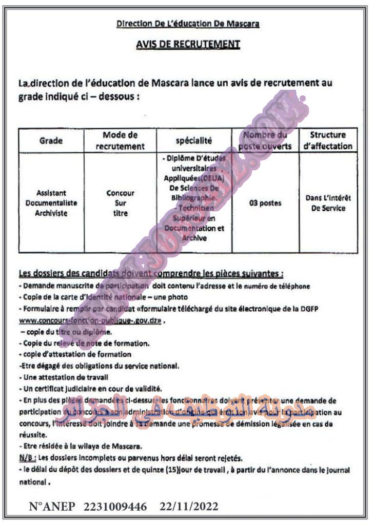 تعلن مديرية التربية لولاية معسكر عن فتح مسابقة توظيف على اساس الشهادة في الرتب المبينة ادناه