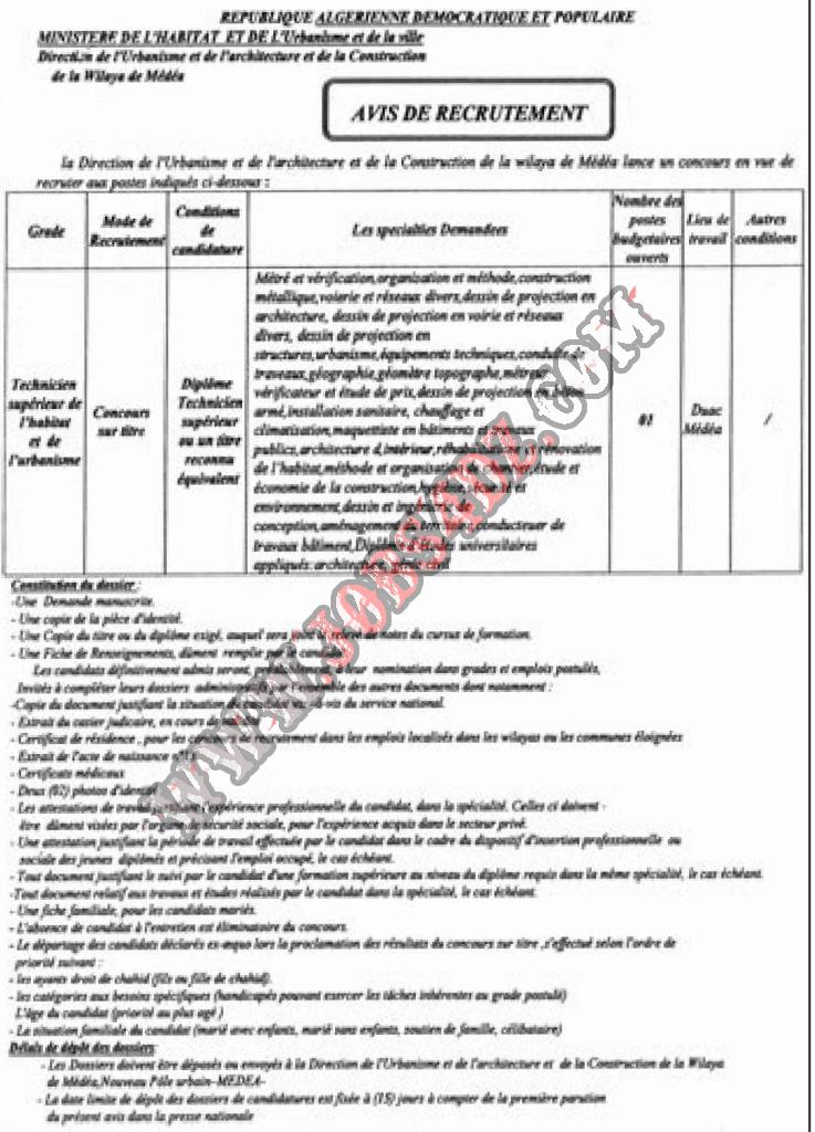 تعلن مديرية التعمير والهندسة المعمارية والبناء لولاية المدية عن فتح مسابقة توظيف على اساس الشهادة للالتحاق بالرتب المذكورة ادناه