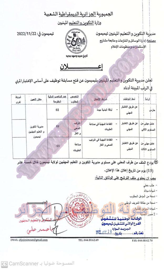 تعلن مديرية التكوين والتعليم المهنيين بتيميمون عن فتح مسابقة توظيف على اساس الاختبار المهني في الرتب المبينة ادناه