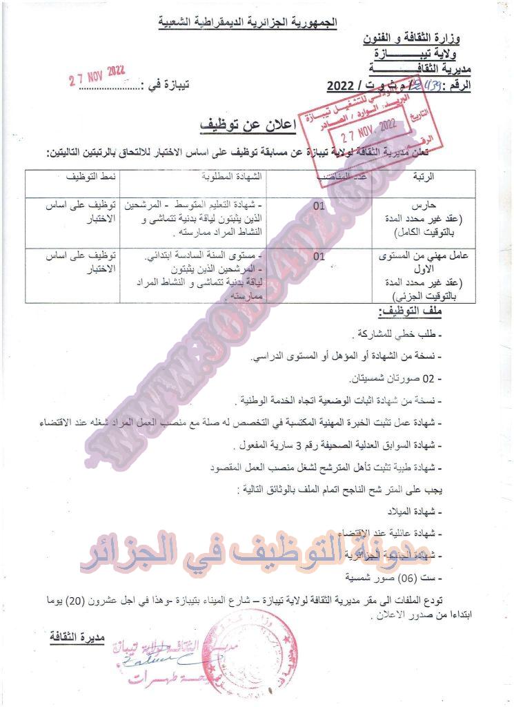 اعلان توظيف بمديرية الثقافة لولاية تيبازة