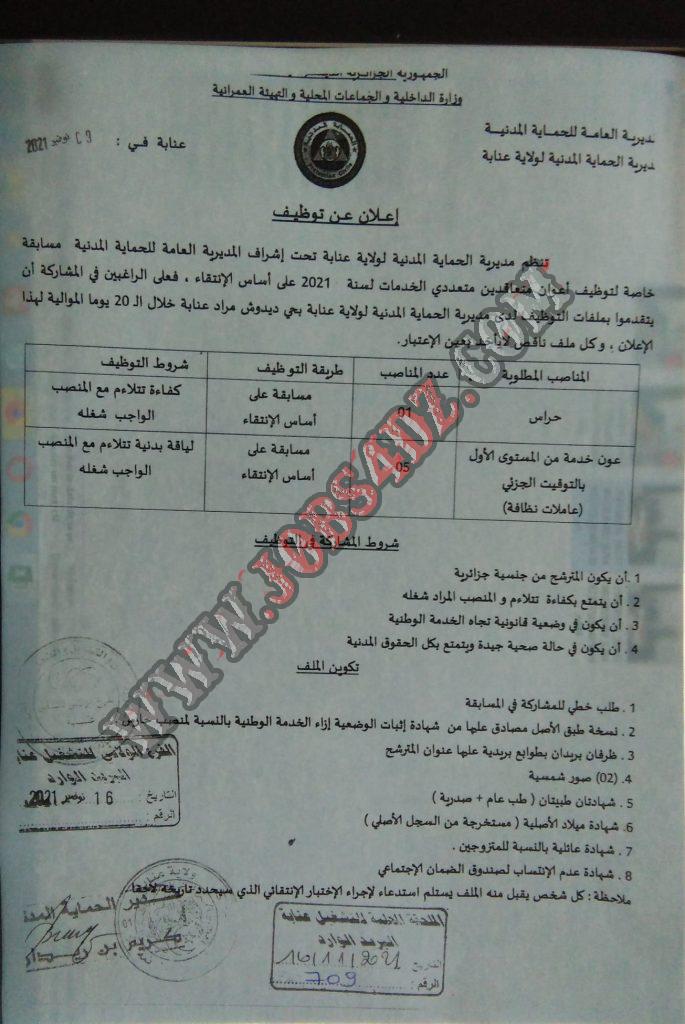 تعلن مديرية الحماية المدنية لولاية عنابة تحت اشراف المديرية العامة للحماية المدنية مسابقة ختصة لتوظيف اعوان متعاقدين متعددي الخدمات لسنة 2021 على اساس الانتنقاء فعلى الراغبين في المشاركة ان يتقدمو بملفات التوظيف لدى مديرية الحماية المدنية لولاية عنابة بحي ديدوش مراد عنابة خلال ال 20 يوما الموالية لهذا الاعلان وكل ملف ناقص لا ياخذ بعين الاعتبار