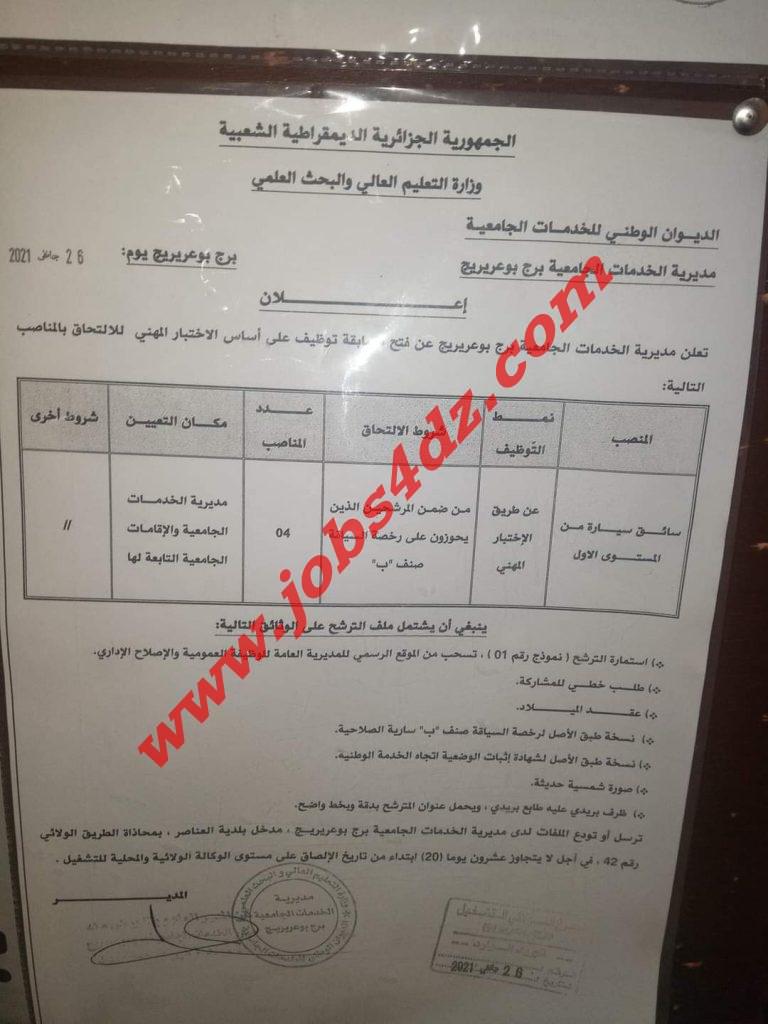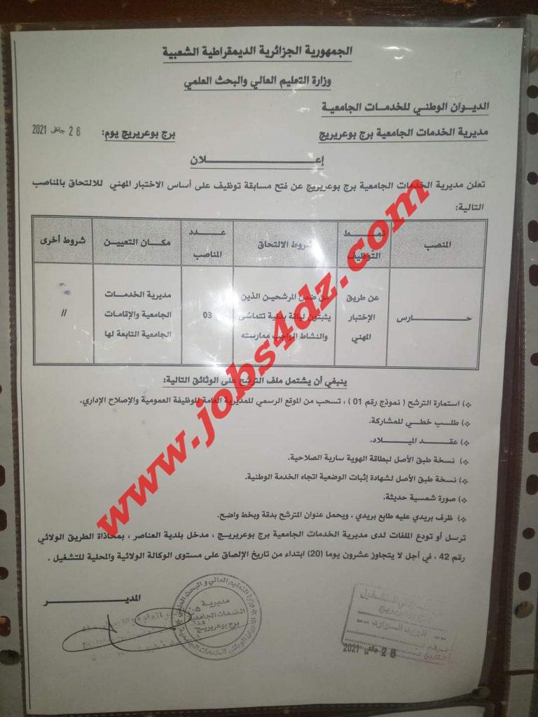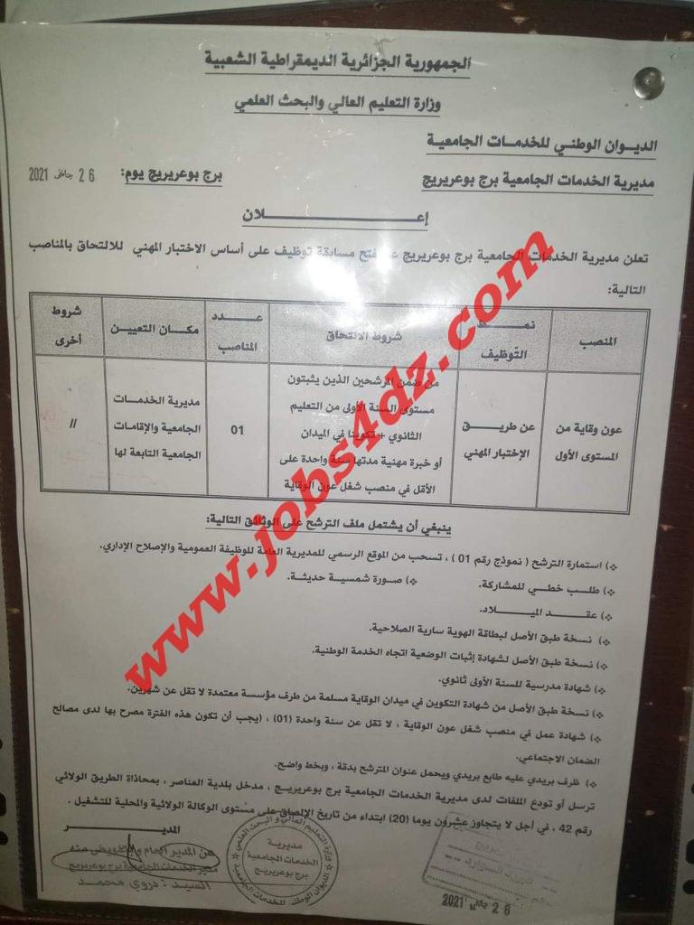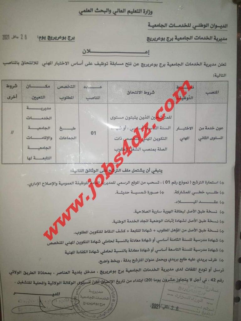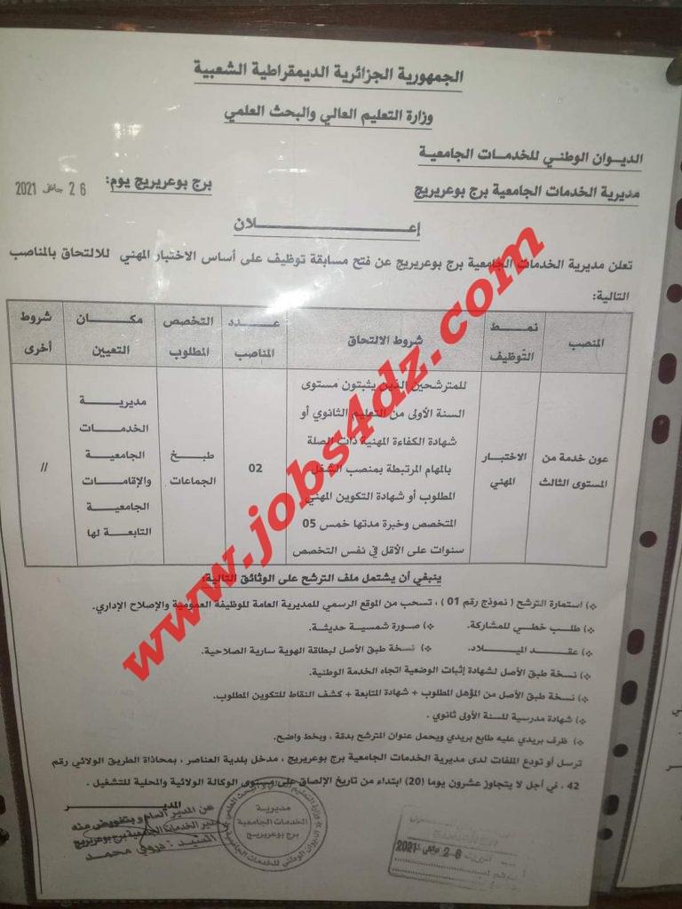 تعلن مديرية الخدمات الجامعية برج بوعريريج عن فتح مسابقة توظيف على اساس الاختبار المهني للالتحاق بالمناصب التالية