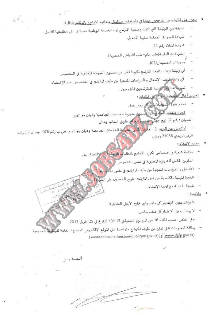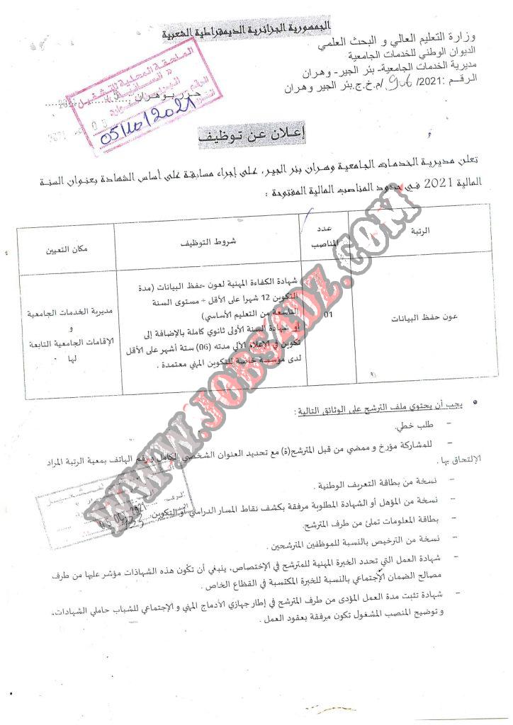 تعلن مديرية الخدمات الجامعية وهران بئر الجير عن اجراء مسابقة على اساس الشهادة بعناون السنة المالية 2021 في حدود المناصب المفتوحة