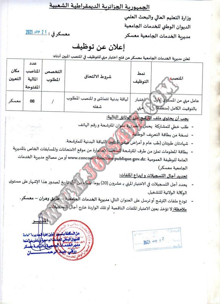 تعلن مديرية الخدمات الجامعية لولاية معسكر عن فتح مسابقة توظيف في مناصب الشغل التالية