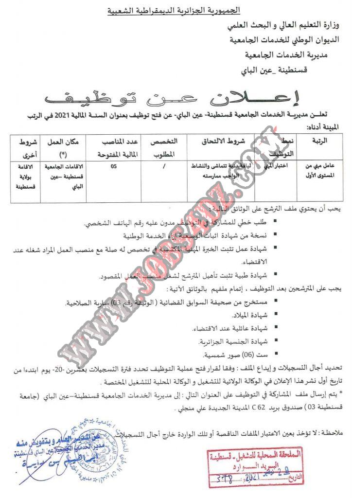 تعلن مديرية الخدمات الجامعية لولاية قسنطينة عن فتح مسابقة توظيف في مناصب الشغل التالية