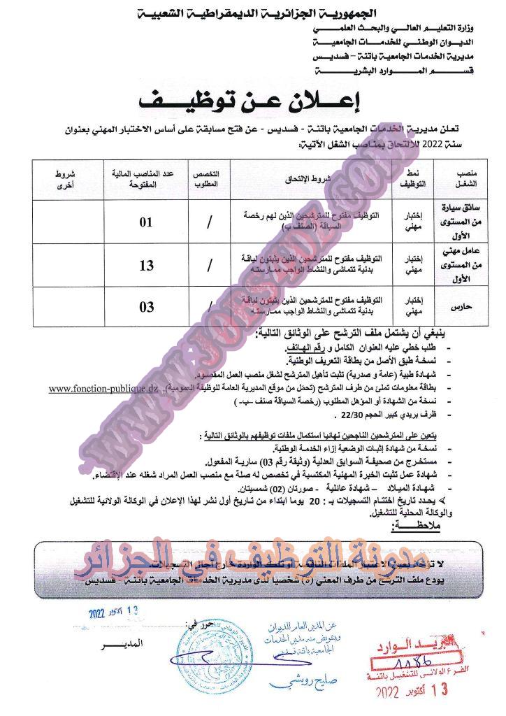 يعلن مديرية الخدمات الجامعية باتنة فسديس عن فتح توظيف على اساس الاختبار المهني في الرتب المبينة ادناه