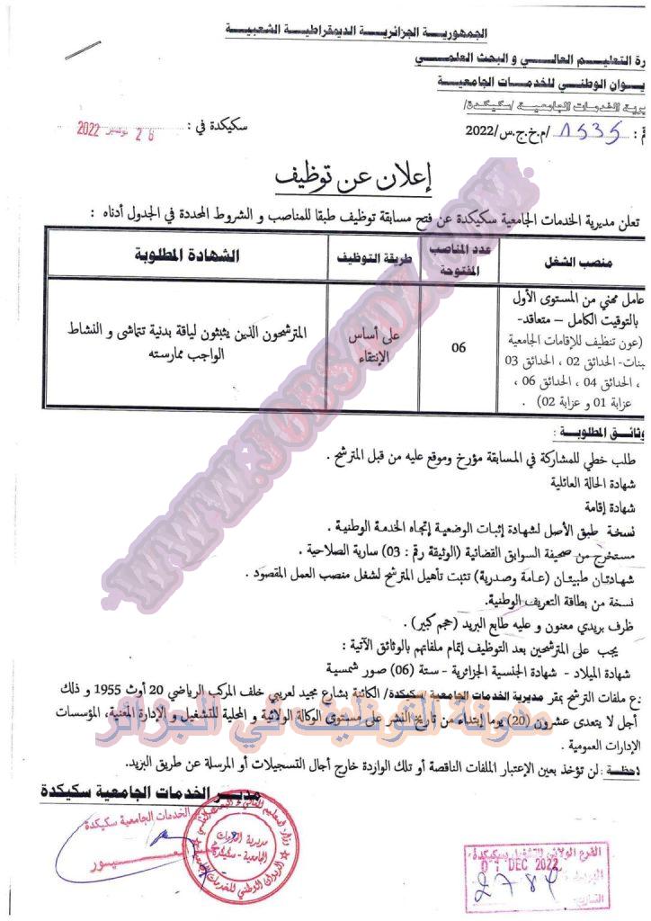 تعلن مديرية الخدمات الجامعية بولاية سكيكدة عن فتح مسابقة توظيف على اساس الانتقاء في الرتب المبينة ادناه