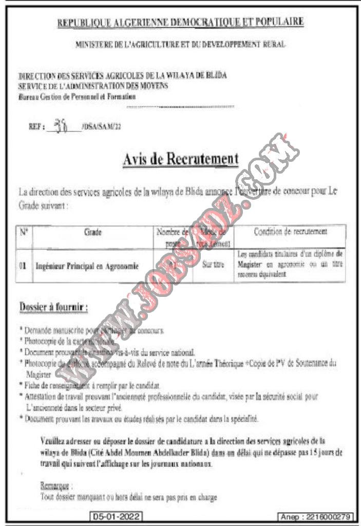 تعلن مديرية الخدمات الفلاحية بولاية البليدة عن فتح مسابقة توظيف على اساس الشهادة في المناصب التالية