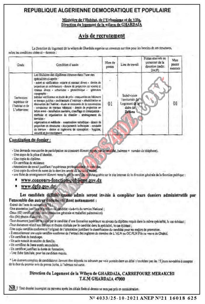 تعلنمديرية السكن لولاية غرداية عن فتح مسابقة للتوظيف في الرتب التالية
