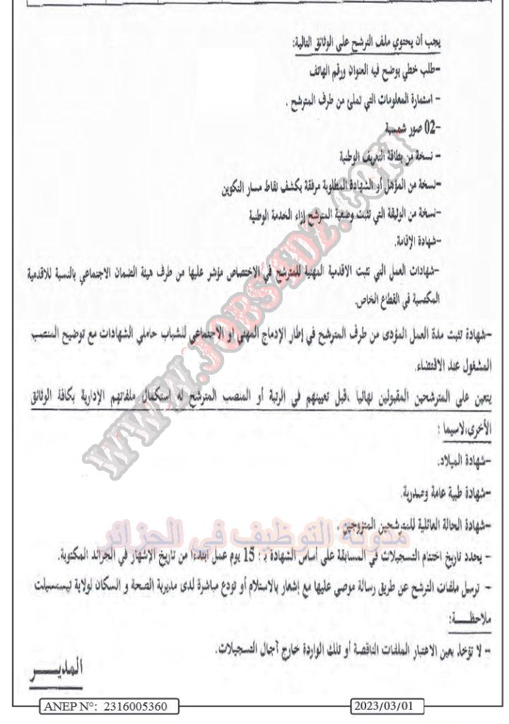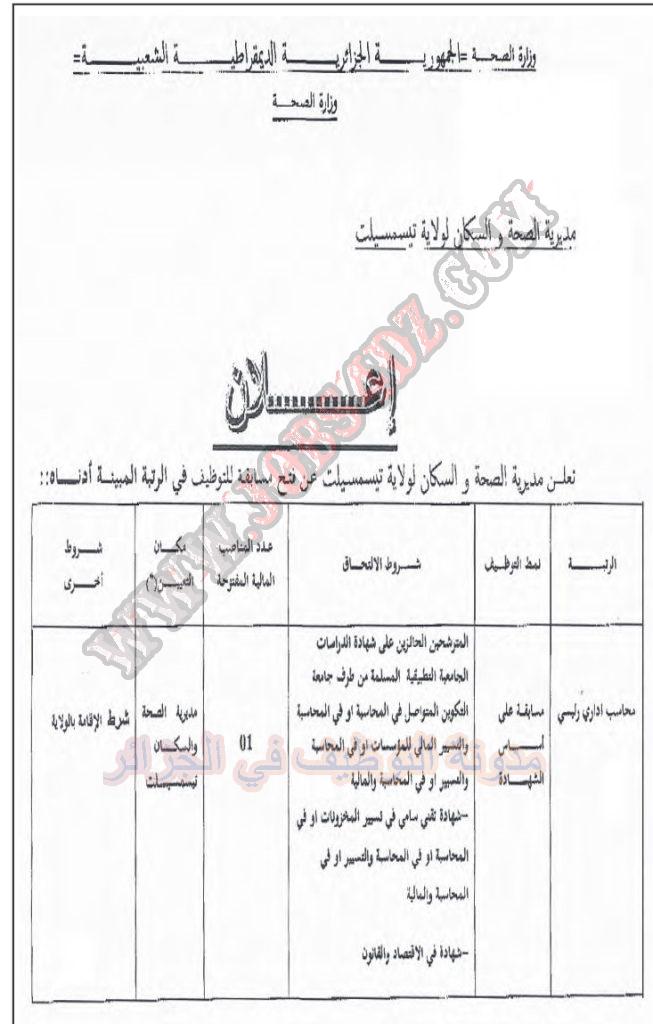 تعلن مديرية الصحة والسكان لولاية تيسمسيلت عن فتح مسابقة توظيف على اساس الشهادة في الرتب المبينة ادناه