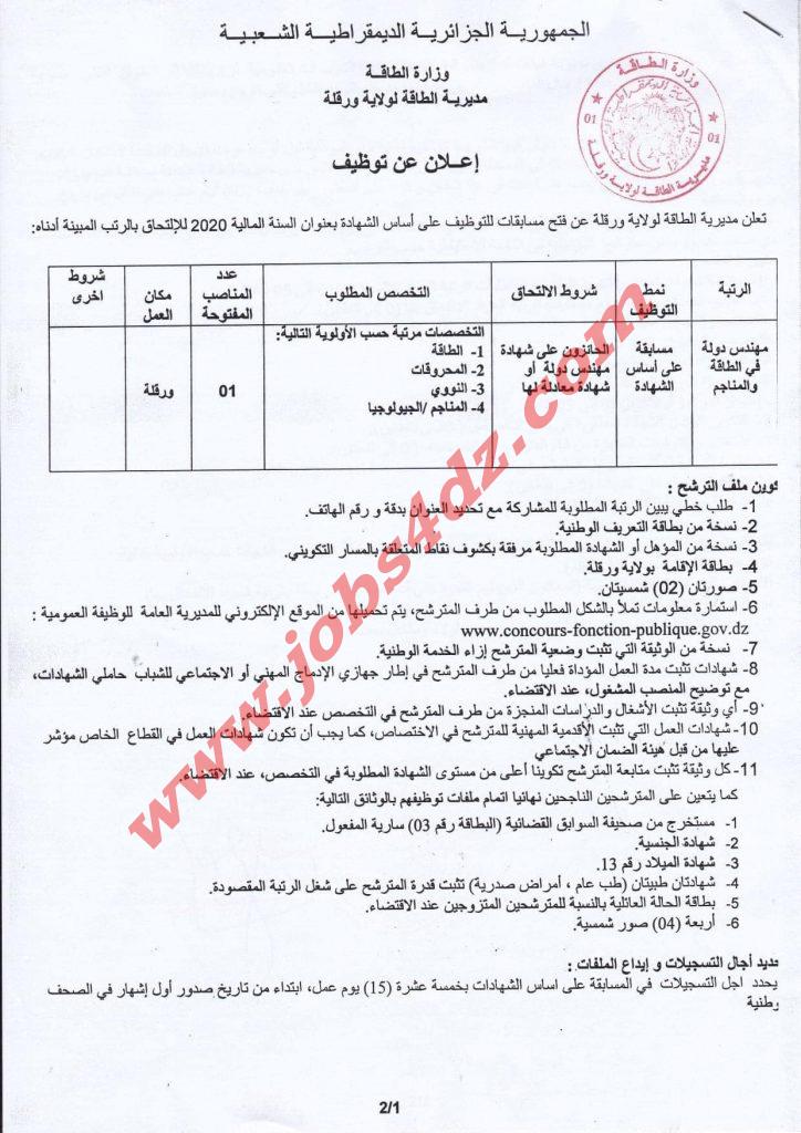 تعلن مديرية الطاقة لولاية ورقلة عن مسابقة توظيف على اساس الشهادة للالتحاق بالمنصب المبين ادناه