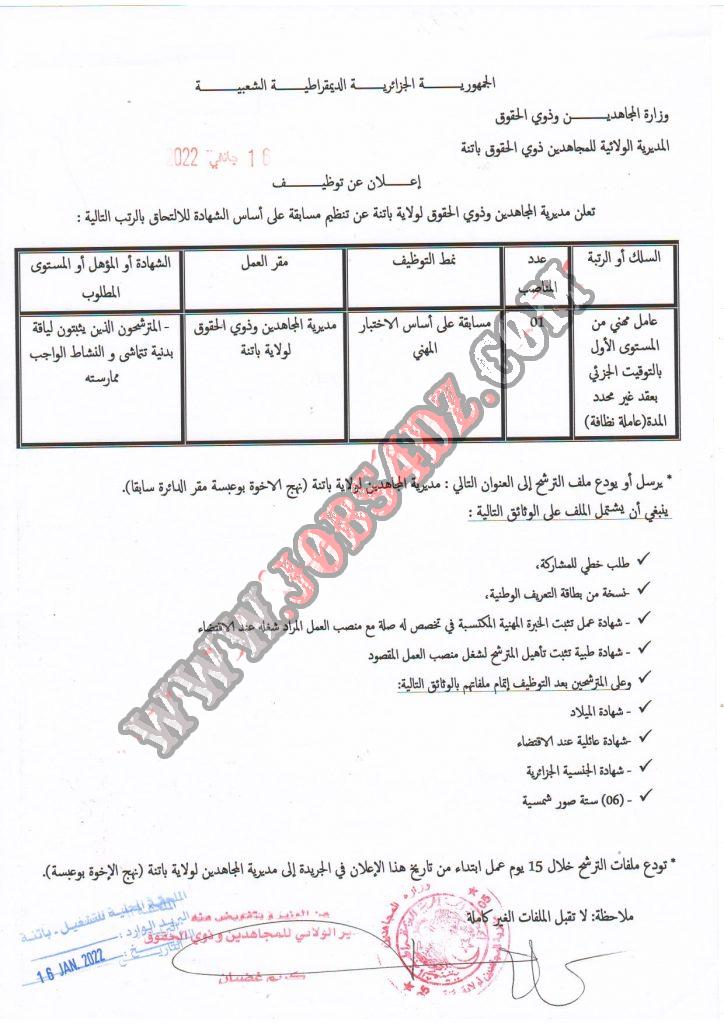 تعلن مديرية المجاهدين وذوي لولاية باتنة عن فتح مسابقة توظيف على اساس الاختبار المهني في الرتبة المبينة ادناه