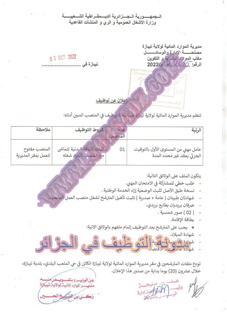 تعلن مديرية الموارد المائية لولاية تيبازة عن فتح توظيف على اساس الاختبار المهني في الرتب المبينة ادناه