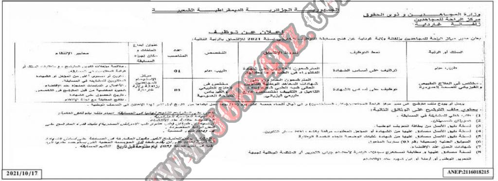 تعلن مديرية مركز الراحة للمجاهدين زلفانة ولاية غرداية عن فتح مسابقة للتوظيف الخارجي لسنة 2021 للالتحاق بالرتب التالية