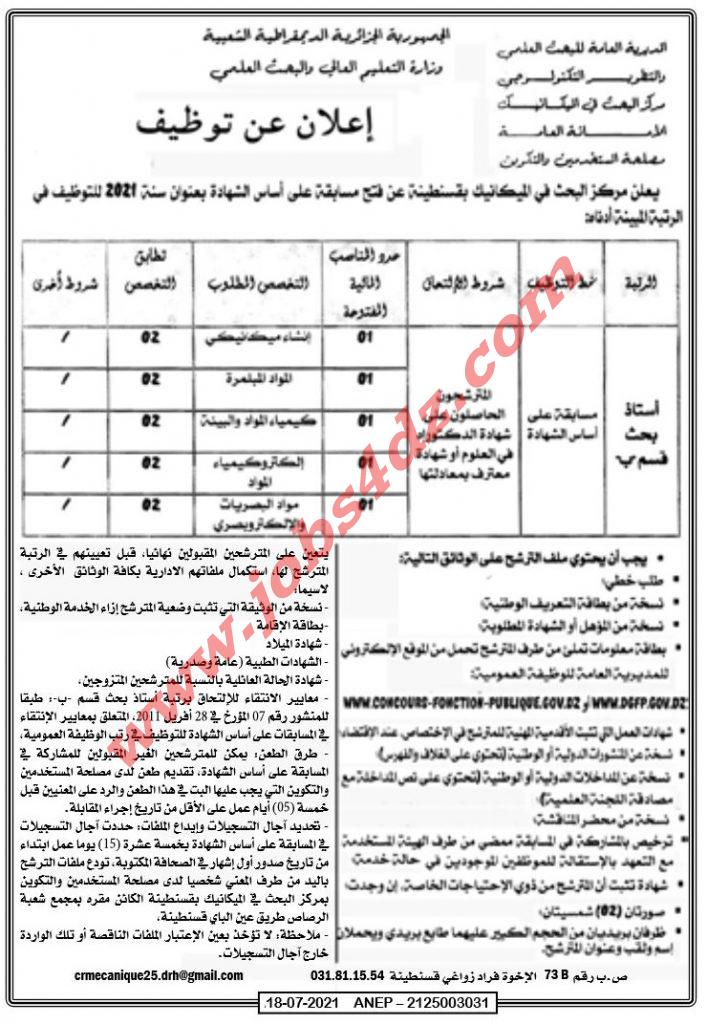 يعلن مركز البحث في الميكانيك بقسنطينة عن فتح مسابقة على اساس الشهادة بعنوان سنة 2021 للتوظيف في الرتب المبينة ادناه