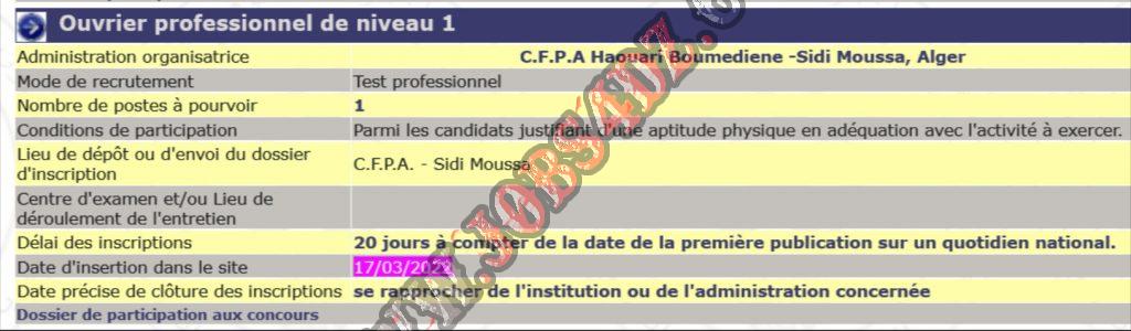 تعلن إدارة مركز التكوين المهني والتمهين هواري بومدين سيدي موسى بالجزائرالعاصمة عن فتح مسابقة للتوظيف على أساس الإختبار المهني في المناصب المدرجة ادناه :