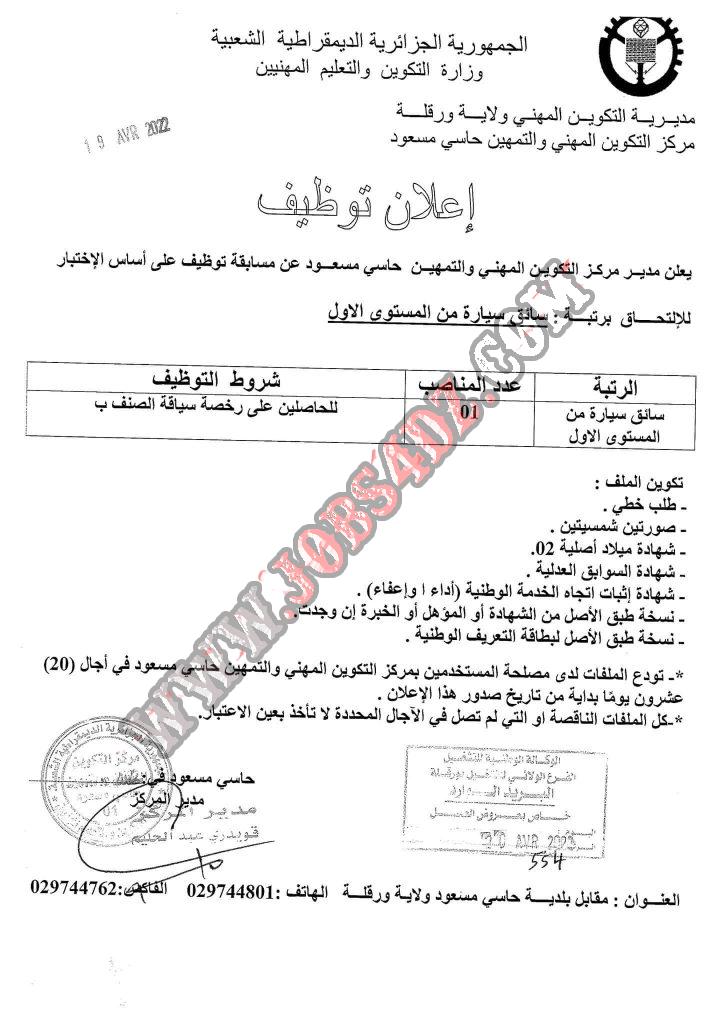 يعلن مدير مركز التكوين المهني والتمهين حاسي مسعود عن مسابقة توظيف على اساس الاختبار للالتحاق برتبة سائق سيارة من المستوى الاول