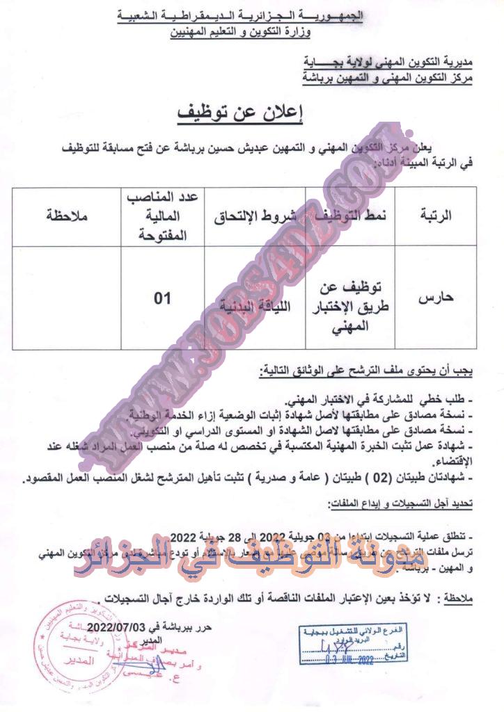 اعلان توظيف بمركز التكوين المهني والتمهين عبديش حسين برباشة بجاية