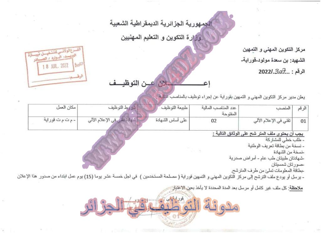 يعلن مركز التكوين المهني والتمهين بقوراية تيبازة عن فتح مسابقة توظيف على اساس الشهادة بعنوان السنة المالية 2022 في المناصب المبينة ادناه